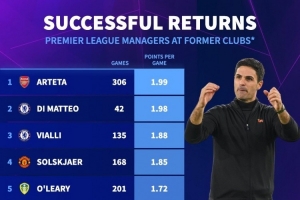 執(zhí)教英超老東家場均積分排名:阿爾特塔1.99分居首,迪馬特奧次席