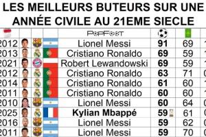 姆巴佩59球進(jìn)入年度射手榜前10!91梅第1 C羅、萊萬69球并列第2