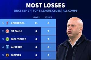 體育資訊11月24日訊 德轉(zhuǎn)統(tǒng)計(jì)了自9月27日以來(lái)五大聯(lián)賽球隊(duì)的輸球榜,利物浦以8場(chǎng)比賽高居榜單第一位。