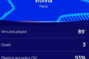 本場比賽維蒂尼亞上演帽子戲法,賽后他也當(dāng)選歐冠官方評選出的本場比賽最佳球員。