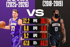 東契奇本季場均35.2分8.8板9.2助 18-19哈登場均36.1分6.6板7.5助