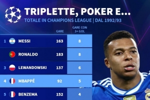 歐冠改制以來單場進(jìn)球3+場次榜:梅西、C羅8場居首,姆巴佩5場