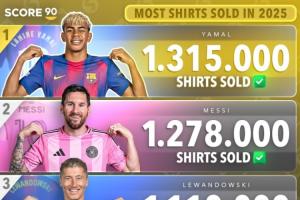 2025年球衣銷量榜:亞馬爾131.5萬居首,梅西次席,C羅第七
