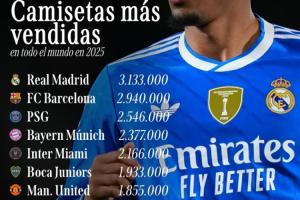 2025俱樂部球衣銷量榜:皇馬313萬居首,巴薩、巴黎前三,曼聯(lián)第7