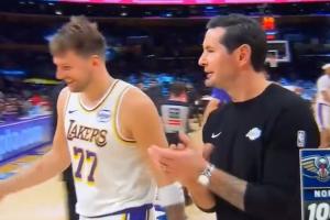 洛杉磯的寶!雷迪克暫停期間在東契奇身邊鼓掌加油 后者笑容滿面