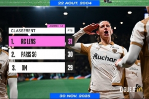朗斯14輪過后積31分位列第一,時(shí)隔21年再次登頂法甲聯(lián)賽積分榜