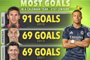 21世紀(jì)單一自然年進(jìn)球榜:梅西91球居首,姆巴佩今年60球第6