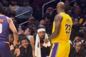 上賽季曾并肩作戰(zhàn)!詹姆斯在場上和場邊的古德溫聊天