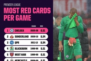 平均3場(chǎng)1張紅牌!切爾西本賽季場(chǎng)均紅牌0.31張,英超歷史最多