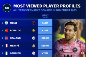 11月德轉球員頁面瀏覽量排名:前三依次為梅西、C羅、哈蘭德