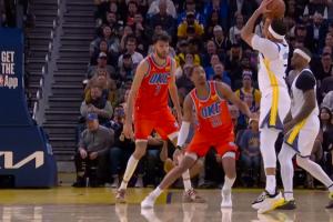 關鍵?。⌒∨孱D底角三分壓哨命中 勇士在第一節(jié)后首次領先雷霆