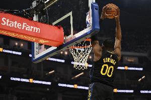 大舉反擊!庫(kù)明加前場(chǎng)籃板暴扣得手 勇士追到4分分差