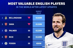 英格蘭球員最新身價榜:貝林壓薩卡居首,帕爾默、賴斯并列第三