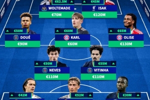 中場:杜埃(巴黎,+5000萬,9000萬)、卡爾(拜仁,+6000萬,6000萬)、奧利塞(拜仁,+6500萬,1.3億)、若昂·內維斯(巴黎,+5000萬,1.1億)、維蒂尼亞(巴黎,+5500萬,1.1億)