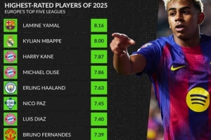 2025五大聯(lián)賽評分榜:亞馬爾壓姆巴佩居首 凱恩、哈蘭德、B費在列