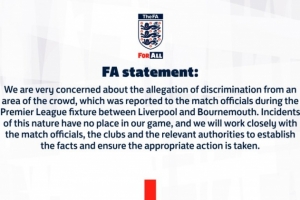體育資訊8月16日訊 英足總發(fā)表聲明,對利物浦4-2伯恩茅斯的比賽中出現(xiàn)歧視行為表示高度關注。