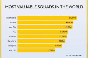體育資訊08月23日訊 英國天空體育援引德轉數據,列出了全球俱樂部球員總身價排名,皇馬以超12億鎊的身價位居首位。
