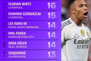 本賽季歐冠創(chuàng)造機會榜:姆巴佩20次居首,維爾茨次席,索博第三