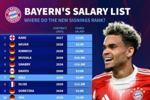 德轉(zhuǎn)列拜仁年薪:凱恩2500萬歐居首,迪亞斯1400萬、杰克遜600萬