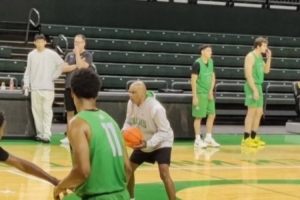 體育資訊9月23日訊 有俄勒岡大學籃球隊粉絲發(fā)布了一張球隊在主場球館訓(xùn)練的照片,從照片中可以看到除了在訓(xùn)練的隊員之外,場邊還站著穿著便裝的林葳。