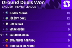 體育資訊9月24日訊 英超第5輪戰(zhàn)罷,squawkafootball列各項數(shù)據(jù)排行,埃弗頓邊鋒恩迪亞耶是贏得地面對抗最多的球員,共計14次。