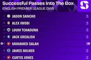 體育資訊9月24日訊 英超第5輪戰(zhàn)罷,squawkafootball列各項(xiàng)數(shù)據(jù)排行,桑喬等5名球員3次成功將球傳入禁區(qū),為本輪聯(lián)賽最多。