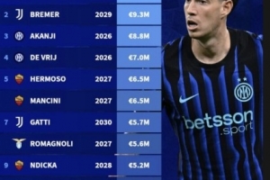 意甲中衛(wèi)稅前年薪排行:巴斯托尼1020萬歐元居首,前四國米三席