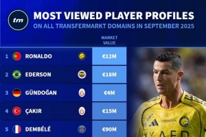 體育資訊10月5日訊 德國轉(zhuǎn)會市場列出了9月份球員頁面瀏覽量排名,C羅居首,埃德森、京多安二三位,梅西排名第7位。