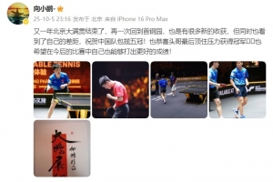 體育資訊10月6日訊 WTT北京大滿貫全部比賽結(jié)束,向鵬在男單1/4決賽中以4-3逆轉(zhuǎn)世界排名第三的雨果殺入半決賽,雖然半決賽惜敗給隊友王楚欽,但本站賽事他表現(xiàn)還是相當出色。本站賽事結(jié)束后,向鵬社媒分享比賽照片,祝賀中國隊包攬五冠,恭喜王楚欽男單奪冠,并自勉希望在以后的比賽中取得更好的成績。