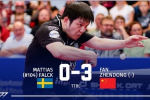 樊振東最終以3-0(11-9, 11-8, 11-6)橫掃法爾克,幫助薩爾布呂肯將大比分扳成2-2。