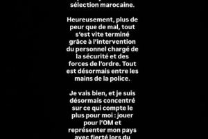 “幸運(yùn)的是,驚嚇大于傷害,事件在安保人員和執(zhí)法部門的及時(shí)介入下迅速平息。目前一切已交由警方處理。我現(xiàn)在很好,也已將注意力重新放在最重要的事情上:為馬賽效力,并在即將到來的國(guó)家隊(duì)集訓(xùn)中自豪地代表祖國(guó)出戰(zhàn)?!?/p>