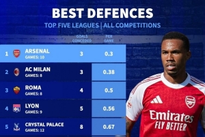 本賽季五大聯(lián)賽球隊(duì)場(chǎng)均失球最少排名(所有賽事):