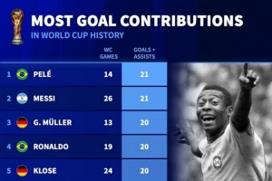 體育資訊10月8日訊 德國轉(zhuǎn)會市場統(tǒng)計了球員在世界杯(決賽圈階段)參與進(jìn)球的數(shù)量,并列出榜單,貝利、梅西參與21球并列居首。