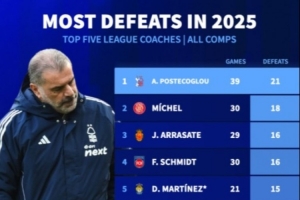 體育資訊10月9日訊 接替努諾成為諾丁漢森林主帥后,波斯特科格魯未能提升球隊(duì)表現(xiàn),反而讓球隊(duì)進(jìn)一步陷入泥沼。根據(jù)德國轉(zhuǎn)會市場的統(tǒng)計(jì),波斯特科格魯是五大聯(lián)賽今年輸球最多的主教練,達(dá)到了21場,而曼聯(lián)主帥阿莫林以15場并列第4。