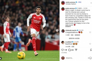 阿森納小將安努斯社媒慶祝首秀:我和家人都很自豪,感恩這次機(jī)會