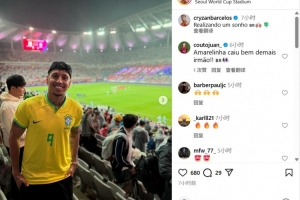 此役山東泰山外援克雷桑身穿自己名字的巴西9號(hào)球衣,現(xiàn)場(chǎng)見(jiàn)證了巴西的大勝。