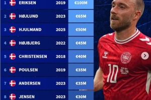 體育資訊10月13日訊 德轉(zhuǎn)統(tǒng)計了丹麥球員歷史身價榜,埃里克森1億歐位列第一。