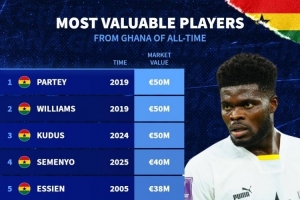 體育資訊10月13日訊 德國轉(zhuǎn)會市場列出加納球員歷史最高身價排名,托馬斯、伊納基-威廉姆斯、庫杜斯5000萬歐居首。