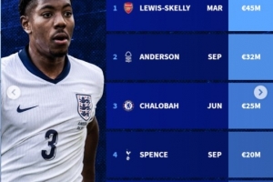 斯凱利(阿森納,3月上演首秀):4500萬歐元