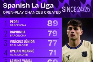 體育資訊10月16日訊 日前,Squawka統計了西甲運動戰(zhàn)創(chuàng)造機會次數排行,佩德里、拉菲尼亞前二,維尼修斯第三。