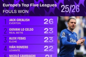 體育資訊10月17日訊 25/26賽季歐洲五大聯(lián)賽中被犯規(guī)次數(shù)排名出爐,來自埃弗頓的格拉利什以26次位居第一。