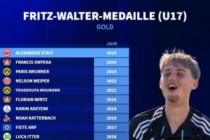 體育資訊10月17日訊 法蘭克福前鋒斯塔夫當(dāng)選德國U17年度最佳新秀,德國轉(zhuǎn)會(huì)市場列出了歷屆德國U17年度最佳新秀名單。