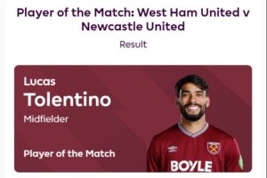 打進(jìn)世界波,官方:帕奎塔當(dāng)選西漢姆聯(lián)vs紐卡全場最佳球員