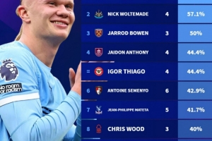 體育資訊10月19日訊 在本輪英超曼城2-0擊敗埃弗頓,哈蘭德梅開二度,本賽季英超打進11球。德轉也盤點了英超單一球員進球占全隊百分比榜單,其中哈蘭德居首,具體如下: