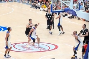 在本場(chǎng)比賽中,周鵬因?qū)κ址朗刳w睿動(dòng)作過(guò)大,揮拳直接把赫羅納男籃的14號(hào)干翻。