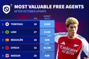 體育資訊10月21日訊 德轉(zhuǎn)更新自由球員身價(jià)排行榜,富安健洋1600萬歐居首,雷吉隆、齊耶赫、帕科位居前十位。
