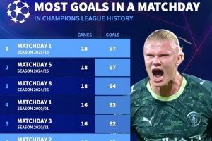 值得一提的是,本賽季歐冠聯(lián)賽階段第三輪今日9場比賽出現(xiàn)43粒進球,剩余9場比賽打進25球就可以打破紀(jì)錄。