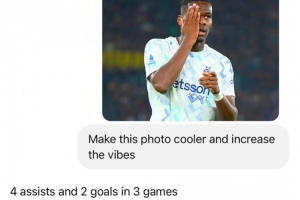 賽后國(guó)米官推曬出用ChatGPT整活的照片,他們將博尼慶祝的照片發(fā)給AI要其修圖,并注明要把圖片變得更酷,氛圍感拉起來(lái),AI答復(fù)道:“3場(chǎng)比賽2球4助攻,沒法更嗨了?!?/p>