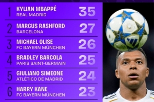 體育資訊10月23日訊 本賽季歐冠聯(lián)賽階段已戰(zhàn)罷3輪,Squawka統(tǒng)計(jì)了到目前為止對(duì)方禁區(qū)內(nèi)觸球次數(shù)榜單,姆巴佩35次第一,拉什福德27次第二。