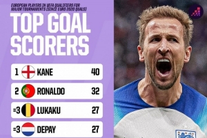 近4屆歐預(yù)賽+歐洲世預(yù)賽射手榜:凱恩40球居首,C羅32球次席